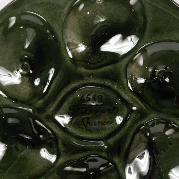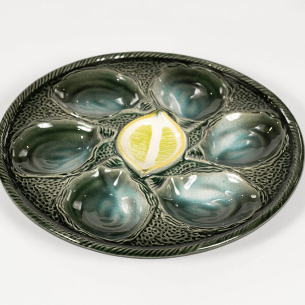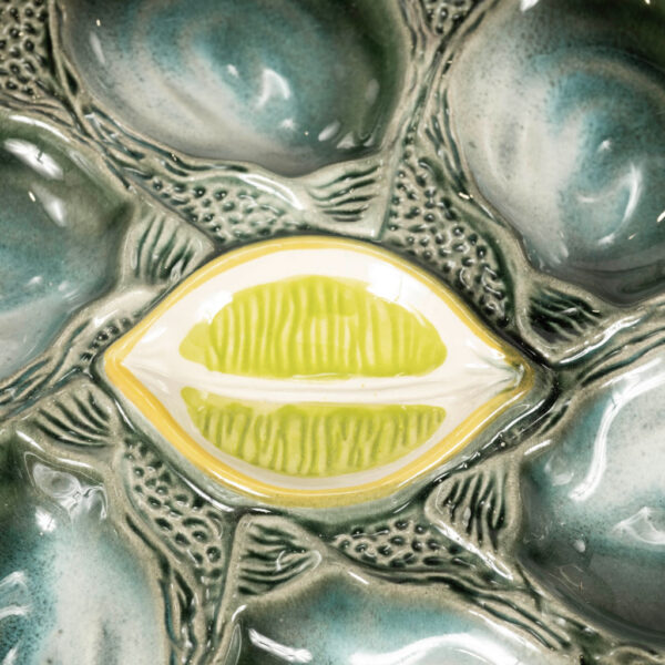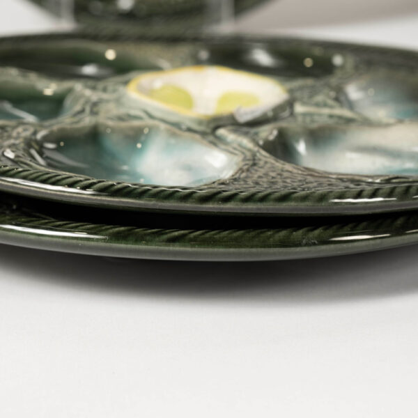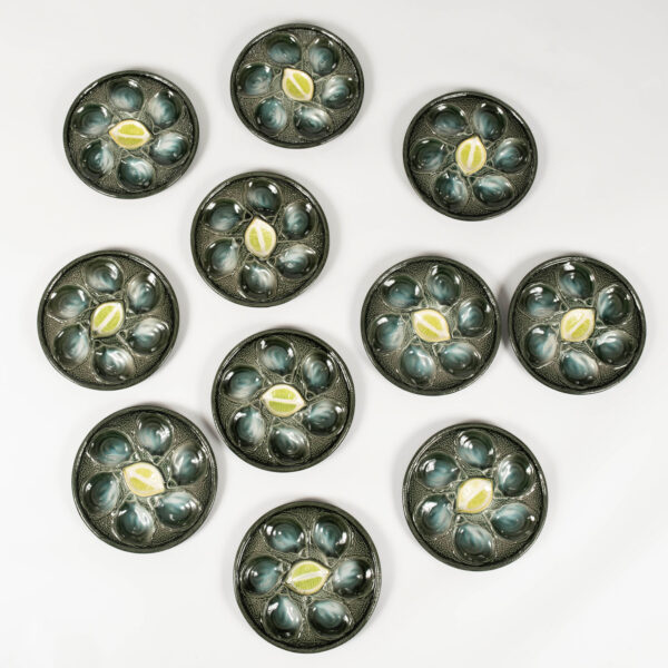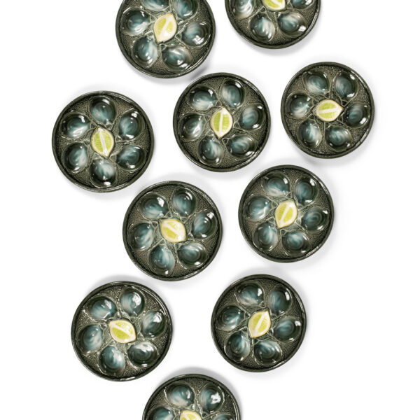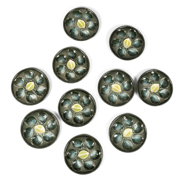 Ten glazed Majolica St. Clément oyster plates. Circa 1920-1929, France. Lemon center oyster plates. Marked with mold number. Sold together. Priced $2,600 as set of ten.