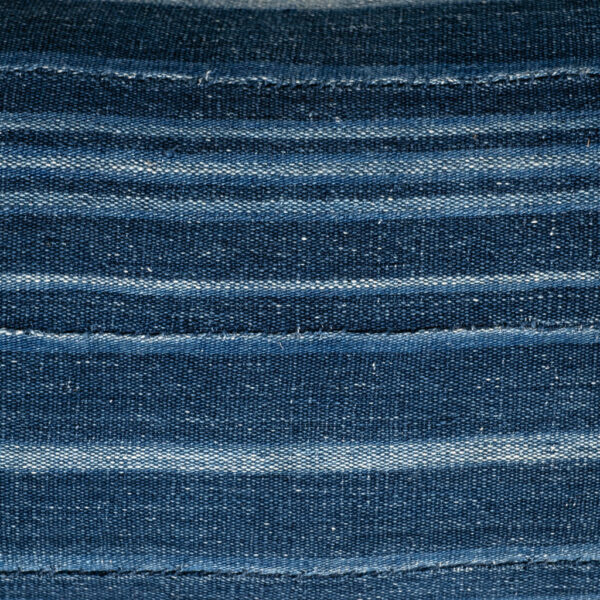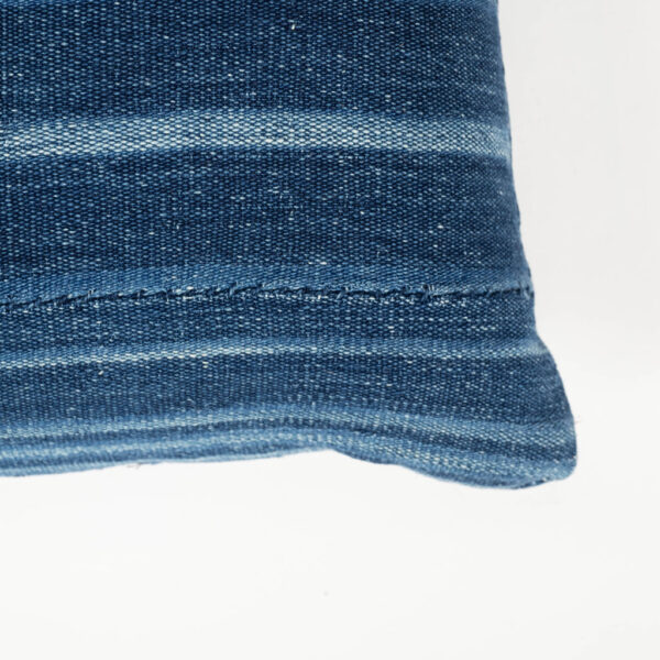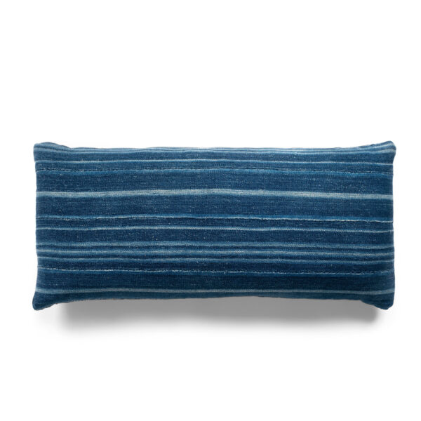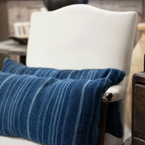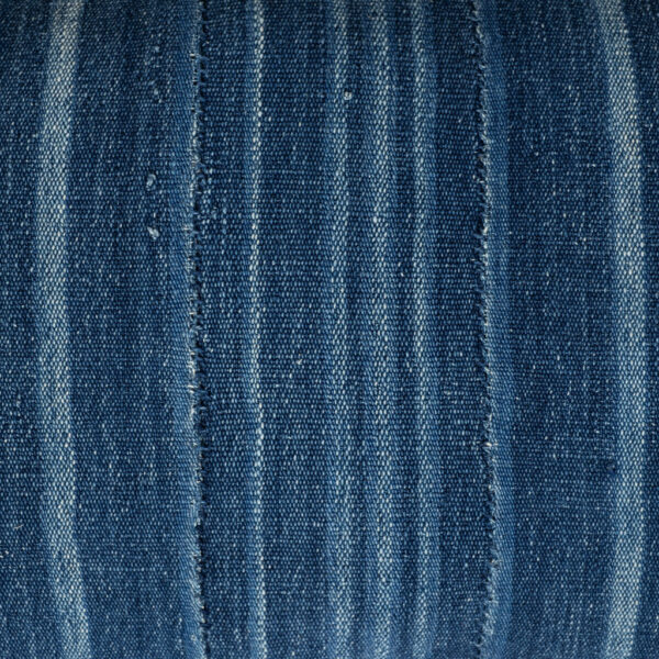 Tone on tone indigo striped lumbar cushion made from a vintage textile. Handwoven and hand dyed faded indigo slubby cotton fabric. Versatile tone on tone indigo stripes run vertically on one face. Self backed stripes run horizontally. This decorative pillow includes a zip fastener and feather insert. Two are available. Sold separately and priced $650 each.