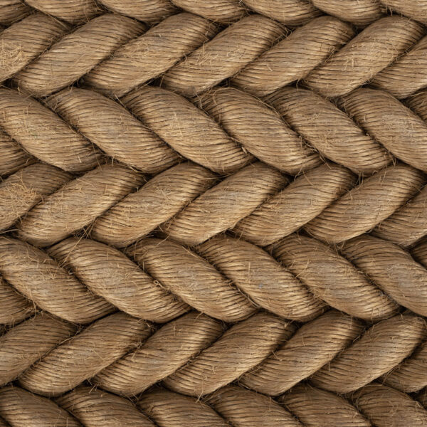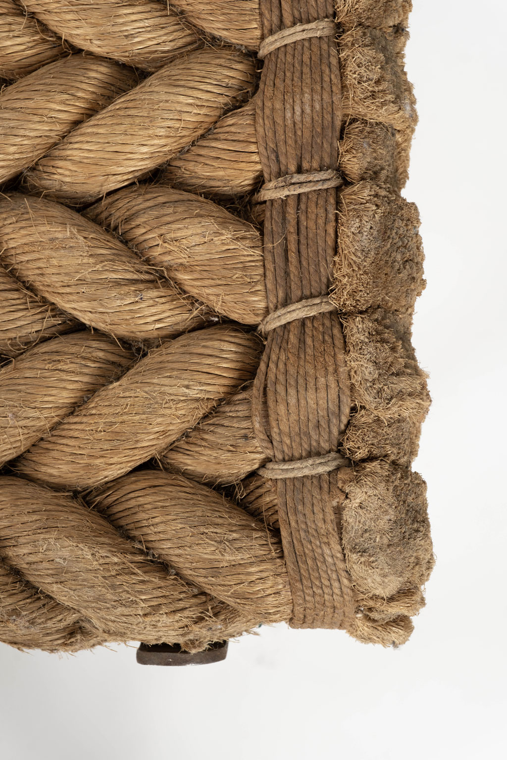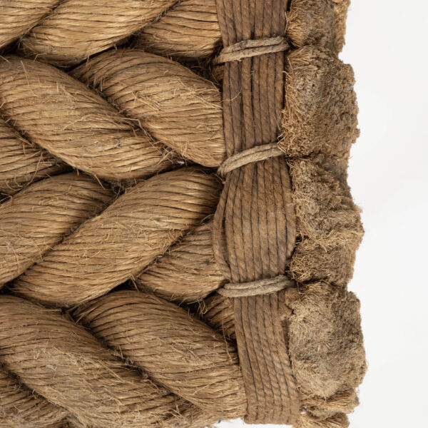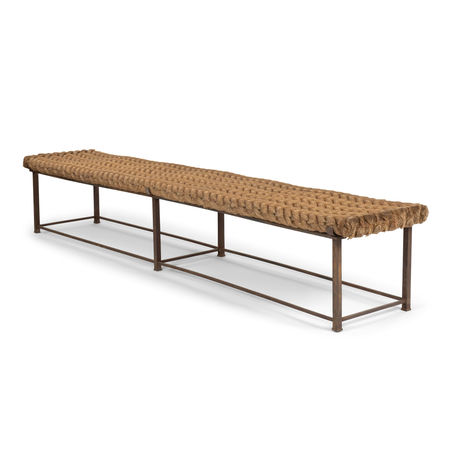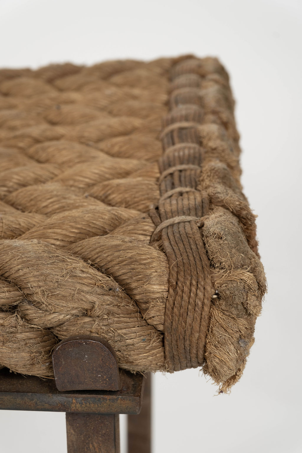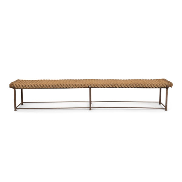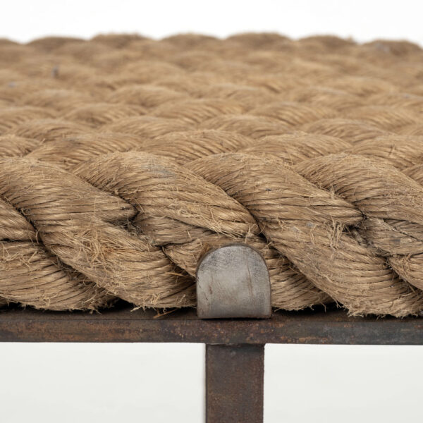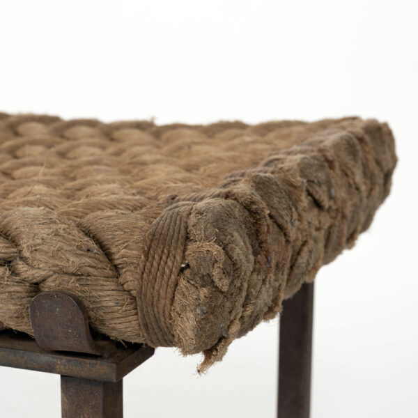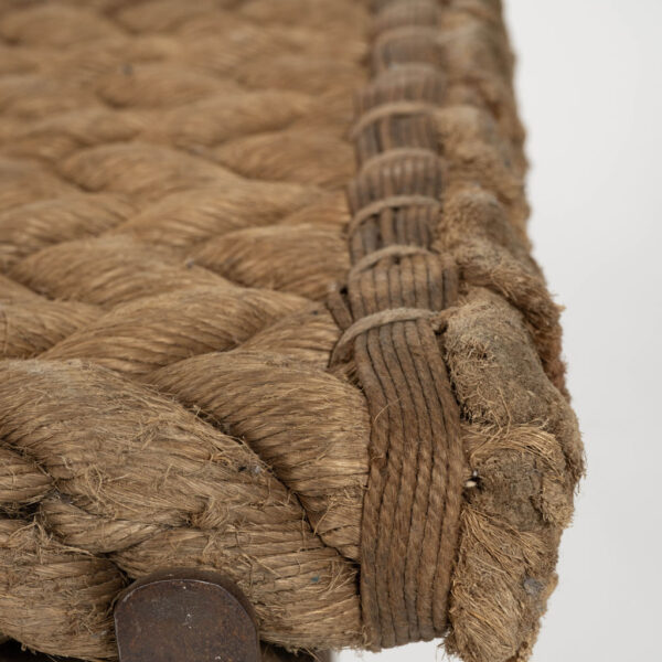 Unique artisan bench with rope seat braided in herringbone design.