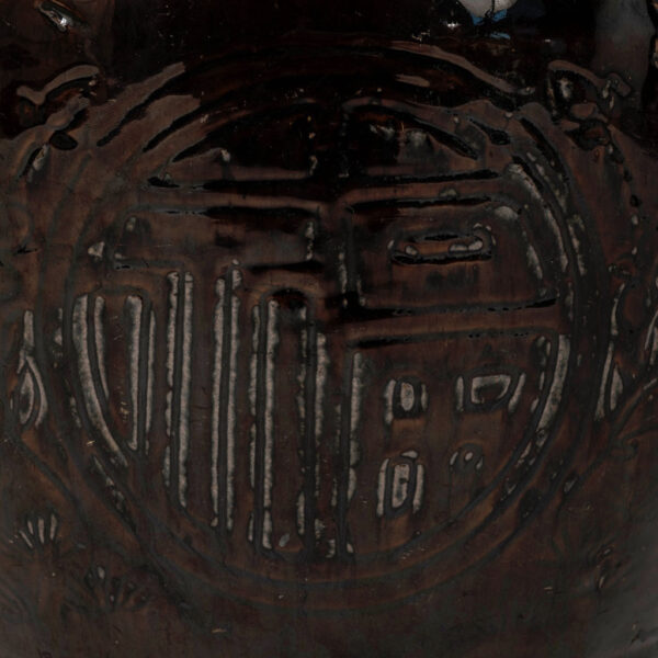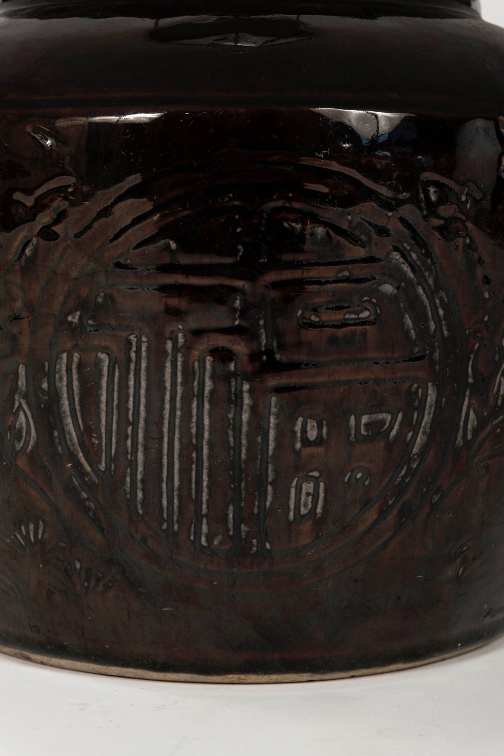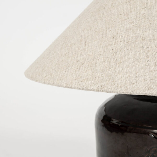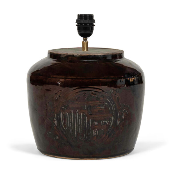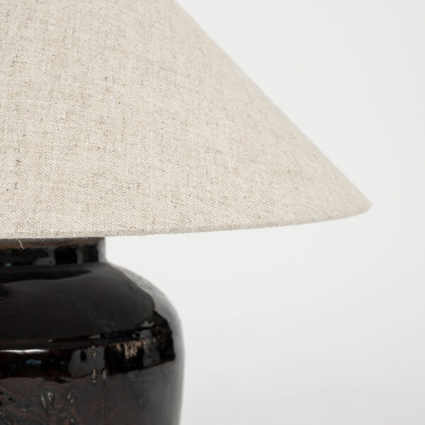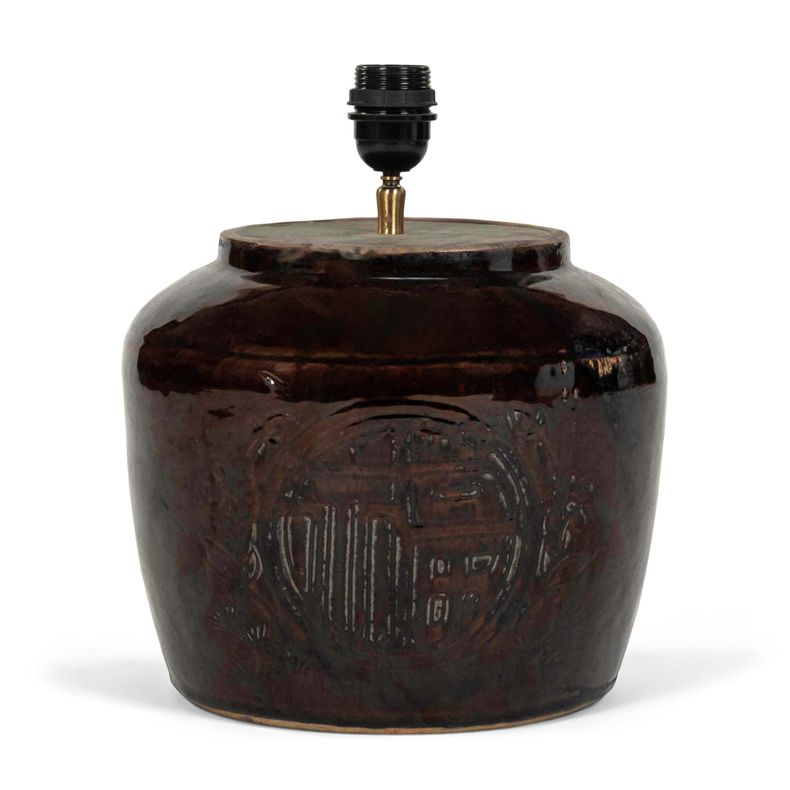 Vintage dark brown glazed pot as table lamp. Dark reddish brown glazed pot, newly wired for use within the USA. Includes linen coolie shade and line switch.